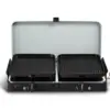 The robust plastic housing with stainless steel cooking surface It is durable and easy to clean. Included are: two grill plates (smooth & ribbed) with high-quality GreenGrill ceramic coating – Perfect for meat, vegetables, or fish. Also included: Pot stand, coffee pot stand and removable windscreens, so that the flame burns reliably even in windy conditions.