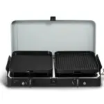 Das robuste Kunststoffgehäuse with Edelstahl-Kochfläche ist langlebig und leicht zu reinigen. Mit dabei sind zwei Grillplatten (glatt & gerippt) mit hochwertiger GreenGrill-Keramikbeschichtung – perfekt für Fleisch, Gemüse oder Fisch. Außerdem im Lieferumfang: Topfständer, Kaffeekannenständer und abnehmbare Windschutzbleche, damit die Flamme auch bei Wind zuverlässig brennt.