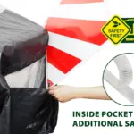 Ein weiteres praktisches Detail ist die integrierte Klarsichttasche, in der das gesetzlich vorgeschriebene Warnschild problemlos untergebracht werden kann. So bleibst du jederzeit regelkonform unterwegs – ohne Bastellösungen oder zusätzliche Halterungen.