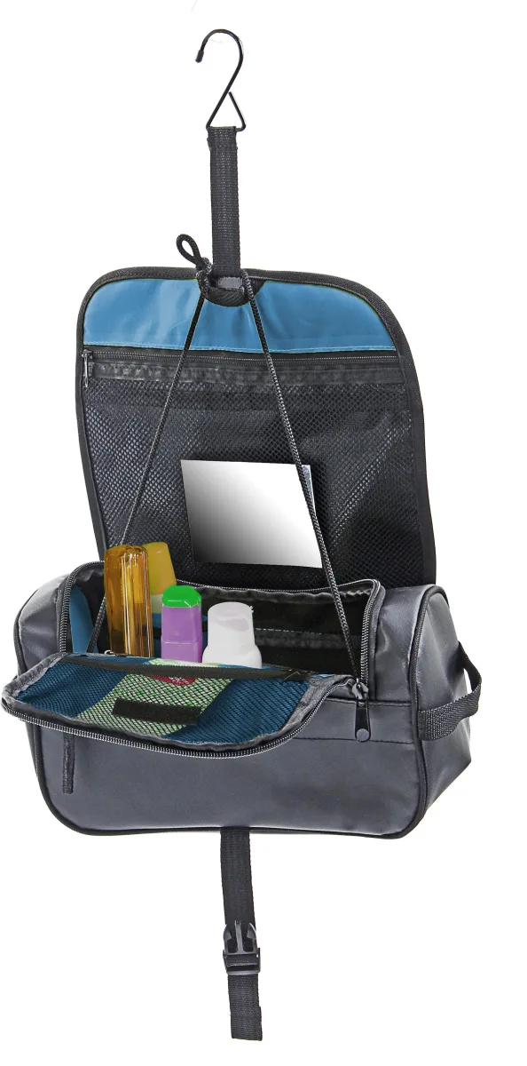 Thanks to the retractable metal hook The Brunner Body & Soul toiletry bag can be hung almost anywhere: in the camper bathroom, on the tailgate, in the tent, in the sanitary facilities at the campsite, or even on branches and hooks. This keeps everything clean, organized, and dry. Side Grip loops make transport even more convenient.