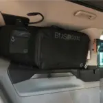 Die Tasche wird mit einstellbaren Webbings (Gurten) sicher an der Platte befestigt. Kein Bohren, kein Schrauben, kein Stress. Die passgenaue Platte wird in der Fensterverkleidung eingesetzt und sitzt stabil – selbst bei längeren Fahrten.