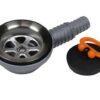 Drain fitting with plug, drain angled at 90° for hose connections of 25mm and 20mm. Bore 55 mm.