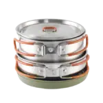 The silikonbeschichteten Edelstahlgriffe liegen angenehm in der Hand und bleiben auch beim Kochen gut kontrollierbar. So kannst du selbst auf kleinen Gaskochern sicher hantieren. Dank des stapelbaren Designs passt das komplette Set platzsparend in den mitgelieferten Packsack – perfekt für Rucksack, Camperküche oder Staufach im Van.