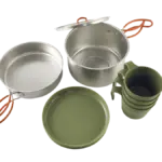 The Easy Camp Moss 4 Kochset punktet außerdem mit seinem vollständigen Lieferumfang: Vier Teller und vier Becher mit Henkel sind bereits enthalten, sodass ihr kein extra Geschirr mitschleppen müsst. Das Tragenetz aus Polyester hält alles zusammen und macht den Transport kinderleicht – egal ob im Camper, Rucksack oder Kofferraum.
