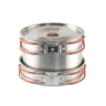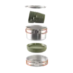 Besonders praktisch im Campingalltag: Alle Teile lassen sich kompakt ineinander stapeln, wodurch das Packmaß angenehm klein bleibt. Die Edelstahlgriffe mit Silikonüberzug liegen gut in der Hand und schützen vor Hitze – so bleibt das Kochen sicher und komfortabel. Nach dem Essen geht’s entspannt weiter, denn das Kochset ist spülmaschinenfest und damit besonders pflegeleicht.