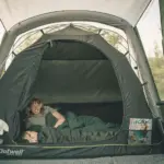 Dank der dunklen Stoffe ist der Schlafbereich effektiv abgedunkelt – ideal für einen erholsamen Schlaf, auch wenn es draußen noch hell ist. Besonders praktisch: Die integrierte Ausrüstungstasche sowie Netztaschen im Innenraum bieten Stauraum für persönliche Gegenstände und sorgen für Ordnung im Zelt.