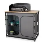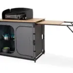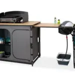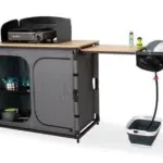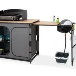 The freistehende Windschutz aus Stahl schützt zuverlässig vor Wind und macht das Kochen im Freien deutlich angenehmer. Dank des kompakten Packmaßes von nur 100 × 49 × 16 cm lässt sich der Küchenschrank problemlos im Wohnmobil, Campervan oder Kofferraum verstauen. Trotz der umfangreichen Ausstattung bleibt das Gewicht mit 19 kg gut handhabbar.