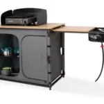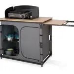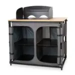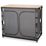 Die stabile Konstruktion besteht aus einem leichten Aluminium-Gestell, kombiniert mit robustem Oxford-Polyester und langlebigen MDF-Einlegeböden. Die ausklappbaren Füße sorgen für eine angenehme Arbeitshöhe und schaffen zusätzlichen Stauraum. Bei Bedarf kann der Küchenschrank auch ohne ausgeklappte Füße genutzt werden – perfekt für kleine Stellplätze oder kompakte Camper.