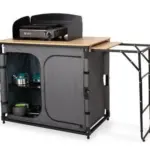 Ein besonderes Highlight ist die 48 cm ausziehbare Bambus-Arbeitsplatte. Bambus überzeugt durch seine hohe Stabilität, natürliche Optik und einfache Reinigung – ideal für den Einsatz im Outdoor-Bereich. Ergänzt wird die Arbeitsfläche durch ein integriertes Spülbecken mit Ablauf sowie einen praktischen Müllbeutelhalter, der für Ordnung beim Kochen sorgt.