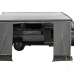 Das Vorzelt besteht aus zwei Seitenteilen, die per Teleskop-Spannstange befestigt werden, sowie einer Frontwand. Alle Elemente können flexibel einzeln oder kombiniert genutzt werden. Große Türen und großzügige, getönte Fenster lassen viel Tageslicht herein und können bei Bedarf komplett abgedunkelt werden – perfekt für Privatsphäre und ein angenehmes Raumgefühl.