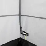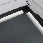 Die integrierte Bodenwanne mit Ablaufgitter ermöglicht einen hygienischen Duschvorgang. Das Vinyl-Dachfenster fördert durch Sonneneinstrahlung das Erwärmen von Wasser in einem optionalen Solarduschsack. Belüftung, Stauraum, Handtuchhalter und eine Reißverschlussöffnung für einen Wasserschlauch komplettieren das Setup.
