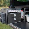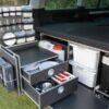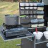 Il CampingBox L-CM è dotato di una cucina estraibile a sinistra, con lavello pieghevole, tanica per l'acqua dolce da 12 litri con rubinetto di scarico, piano cottura a gas a 1 fuoco su un ripiano pieghevole, scomparto per utensili pieghevole con 4 scatole per alimenti freschi, bicchieri di plastica, cassetto per le posate e 2 cassetti.