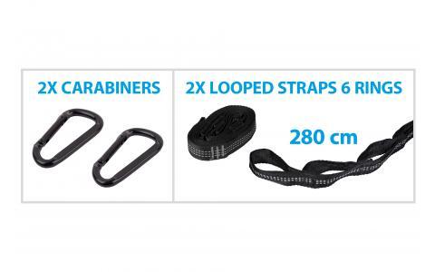 Amaca da viaggio realizzata in tessuto sintetico ultraleggero e super resistente. Offre un'ampia superficie di appoggio e una capacità di carico massima di 300 kg. Molto compatta per il trasporto grazie alla pratica borsa inclusa nella confezione, che funge anche da piccola tasca per occhiali da sole, cellulare, monete, ecc. Perfetta per attività all'aperto, campeggio, gite in moto e in bicicletta. Materiale di montaggio incluso.
