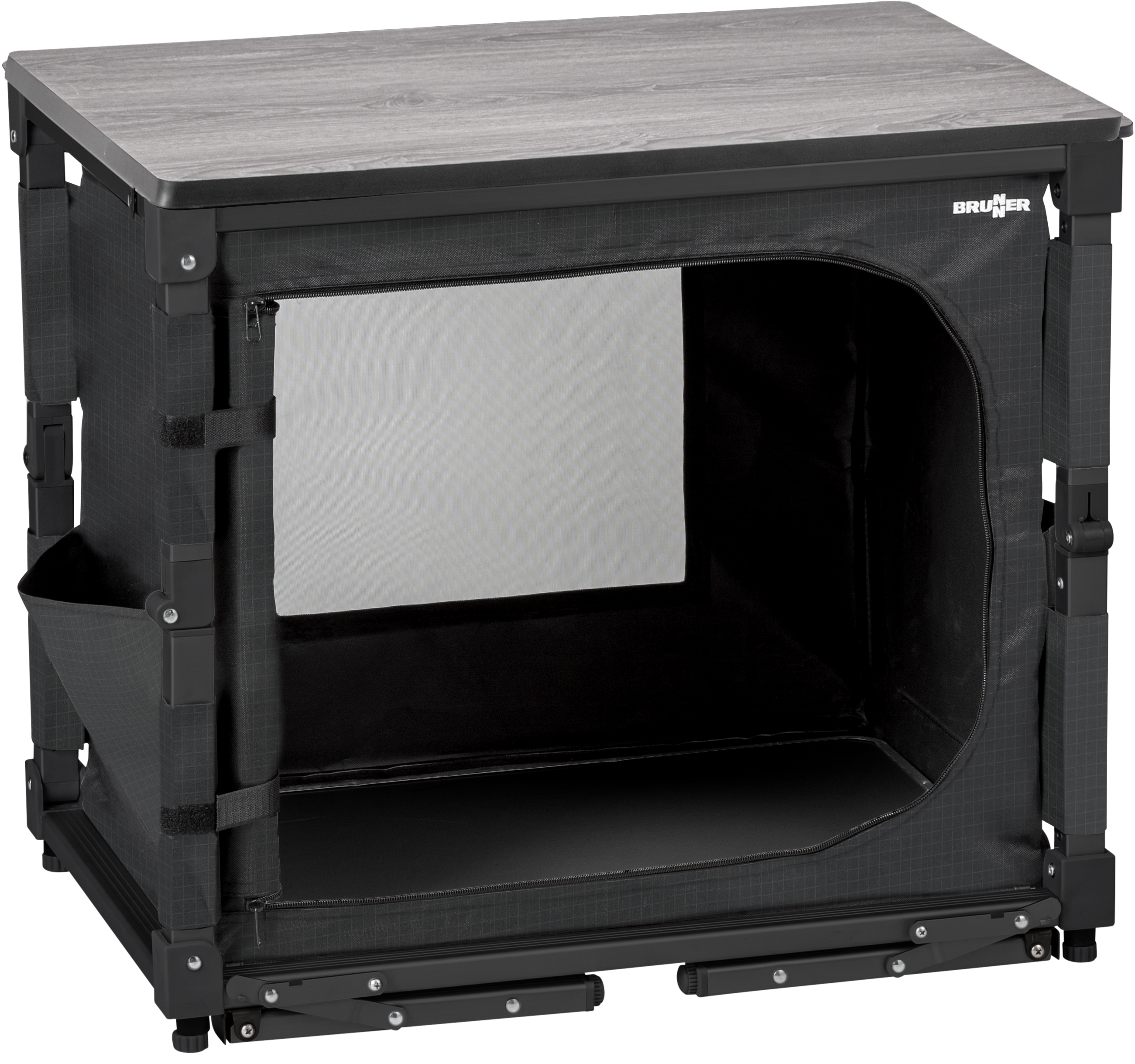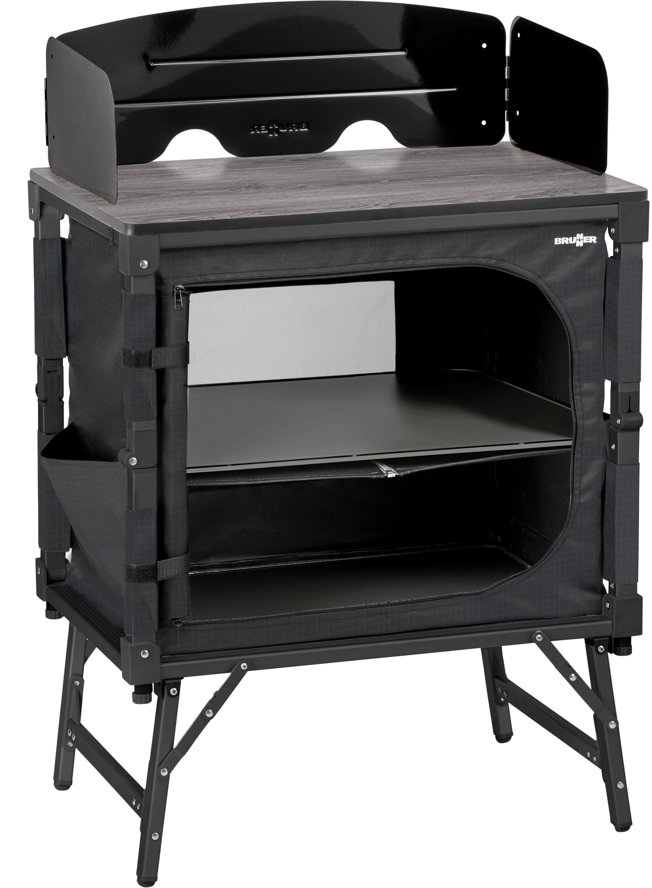 Una volta ripiegata, la cucina da campeggio colpisce per la sua dimensioni di imballaggio estremamente compatte. Si ripone rapidamente e occupa pochissimo spazio nel veicolo. Il robusto telaio in alluminio garantisce stabilità, mentre la resistente copertura in poliestere rimane durevole anche con un uso frequente. Esattamente ciò che ci si aspetta da una cucina da campeggio di alta qualità. Brunner previsto.