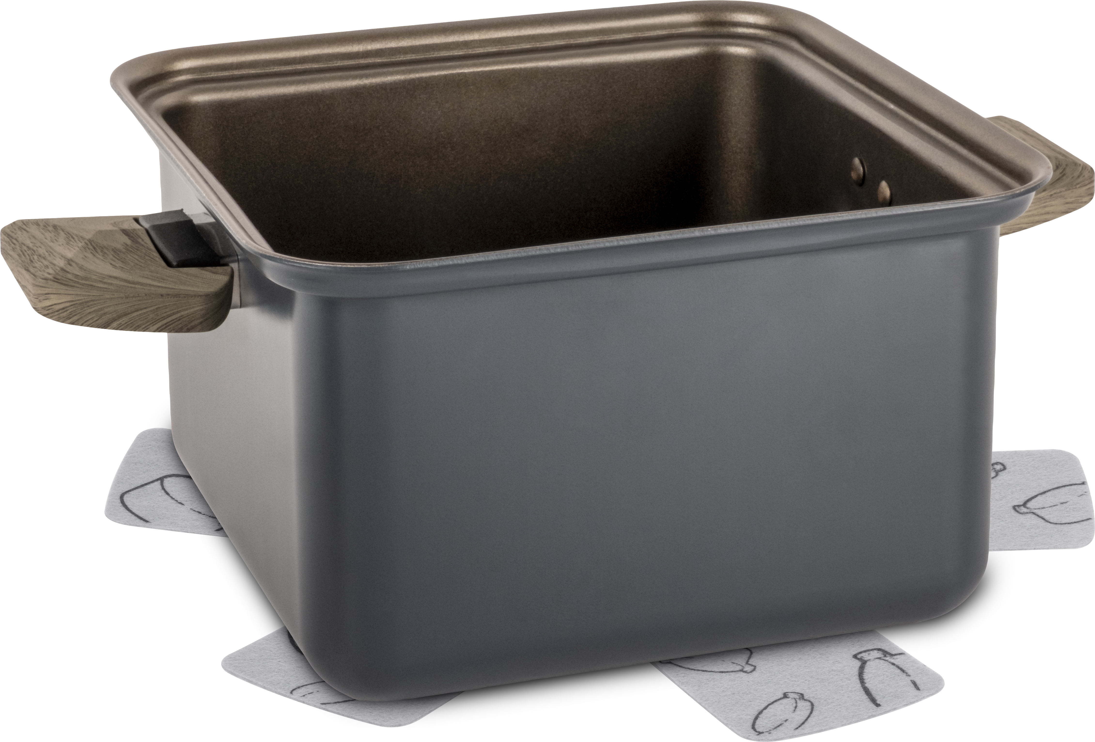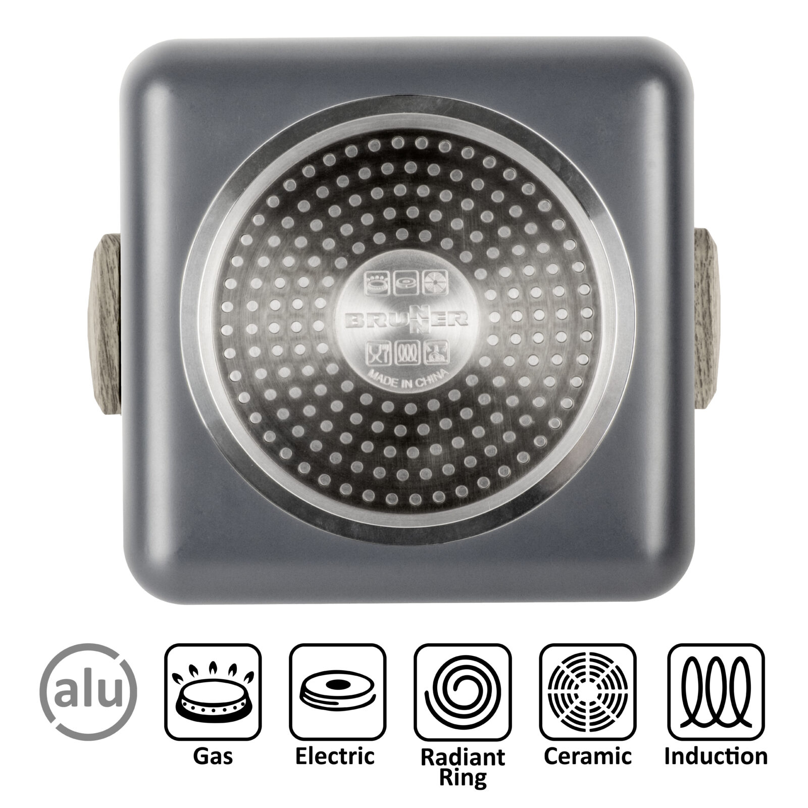 Fatto da alluminio riciclato di alta qualità, Il set di pentole Torralta Square unisce sostenibilità e robustezza. Il materiale garantisce un distribuzione uniforme e rapida del calore, Ciò consente una preparazione dei cibi efficiente e a risparmio energetico. Particolarmente pratico: il set è adatto all'induzione e quindi estremamente versatili, sia che si tratti di fornelli a gas, elettrici o a induzione.