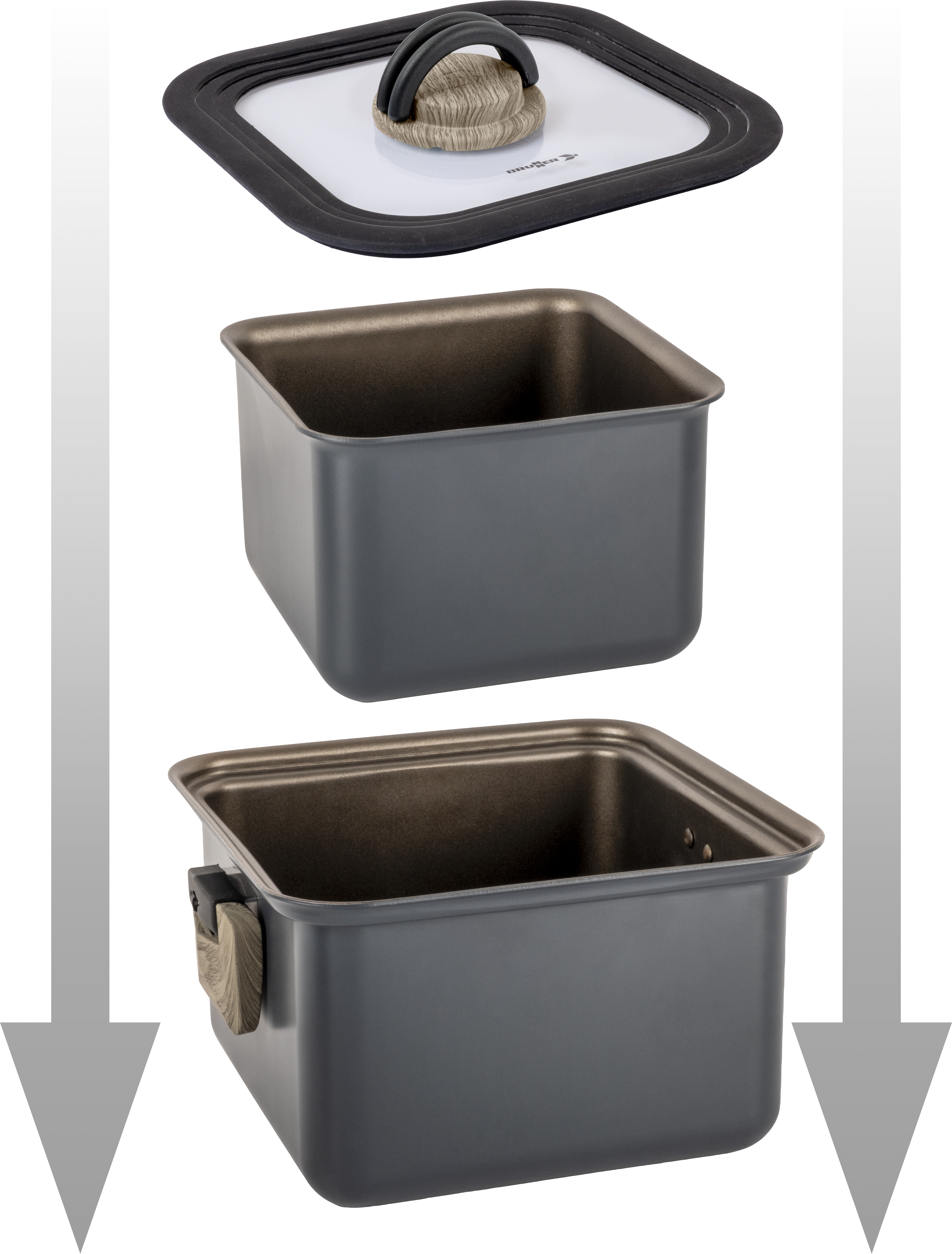 IL Brunner Torralta Set pentole quadrate Ø20 cm è la soluzione perfetta per chi non vuole rinunciare alla buona cucina quando viaggia, sia in camper, motorhome, furgone o in barca. Questo innovativo, set di vasi quadrati Progettato appositamente per spazi di archiviazione limitati, colpisce per il suo design intelligente e impilabile, senza maniglie fisse. Questo ti consente di sfruttare al meglio ogni centimetro del tuo armadio.