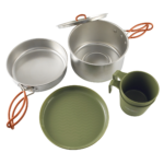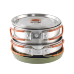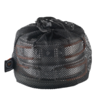 Il maniglie in acciaio inox rivestite in silicone Si adattano comodamente alla mano e rimangono facili da controllare anche durante la cottura. Questo consente di maneggiarli in sicurezza, anche su piccoli fornelli a gas. Grazie al design impilabili L'intero set entra nella sacca inclusa, risparmiando spazio: perfetto per uno zaino, una cucina da camper o un vano portaoggetti in un furgone.