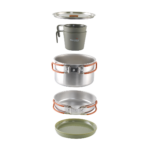 IL Easy Camp Moss 2 Set da Cucina è un set da cucina da campeggio compatto per 2 persone, che contiene tutto ciò di cui hai bisogno in viaggio: pentola, padella, piatto e tazza, impilabili in modo intelligente, leggeri e super pratici per il campeggio, il trekking e la vita in furgone.