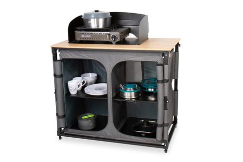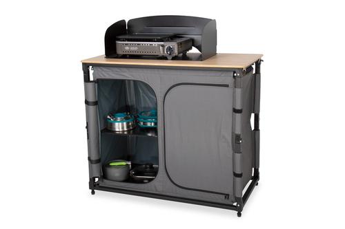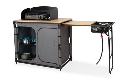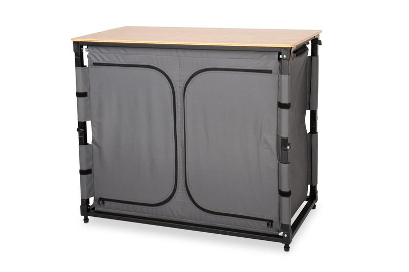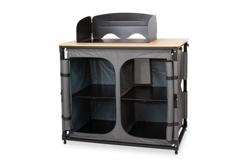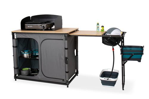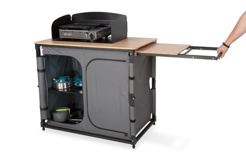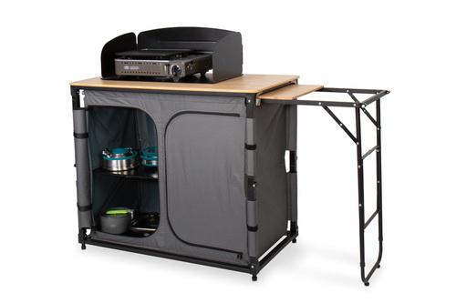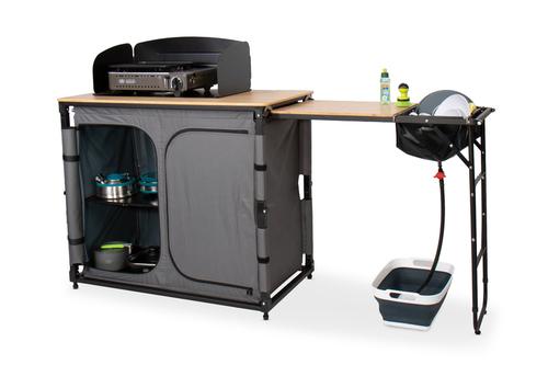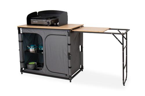 Die Campingküche ist in Sekunden einsatzbereit durch das komfortable Schnellaufbau-System. Alle Küchen besitzen eine Bambus-Arbeitsplatte, ein leichtes Aluminium-Gestell, Einlegeböden aus stabilen MDF-Platten und einen Windschutz.