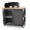 Un punto culminante importante è il comodo sistema di montaggio rapido. Il mobile da cucina si monta in pochi secondi, senza bisogno di attrezzi. Particolarmente pratico dopo un lungo viaggio o per brevi soste. piedini pieghevoli garantire un'altezza di lavoro confortevole e allo stesso tempo fornire spazio di archiviazione aggiuntivo sotto la cucina. Naturalmente, puoi usare anche il mobile della cucina. senza piedi spiegati Usalo: è perfetto se vuoi risparmiare spazio o se ti trovi su un terreno irregolare.