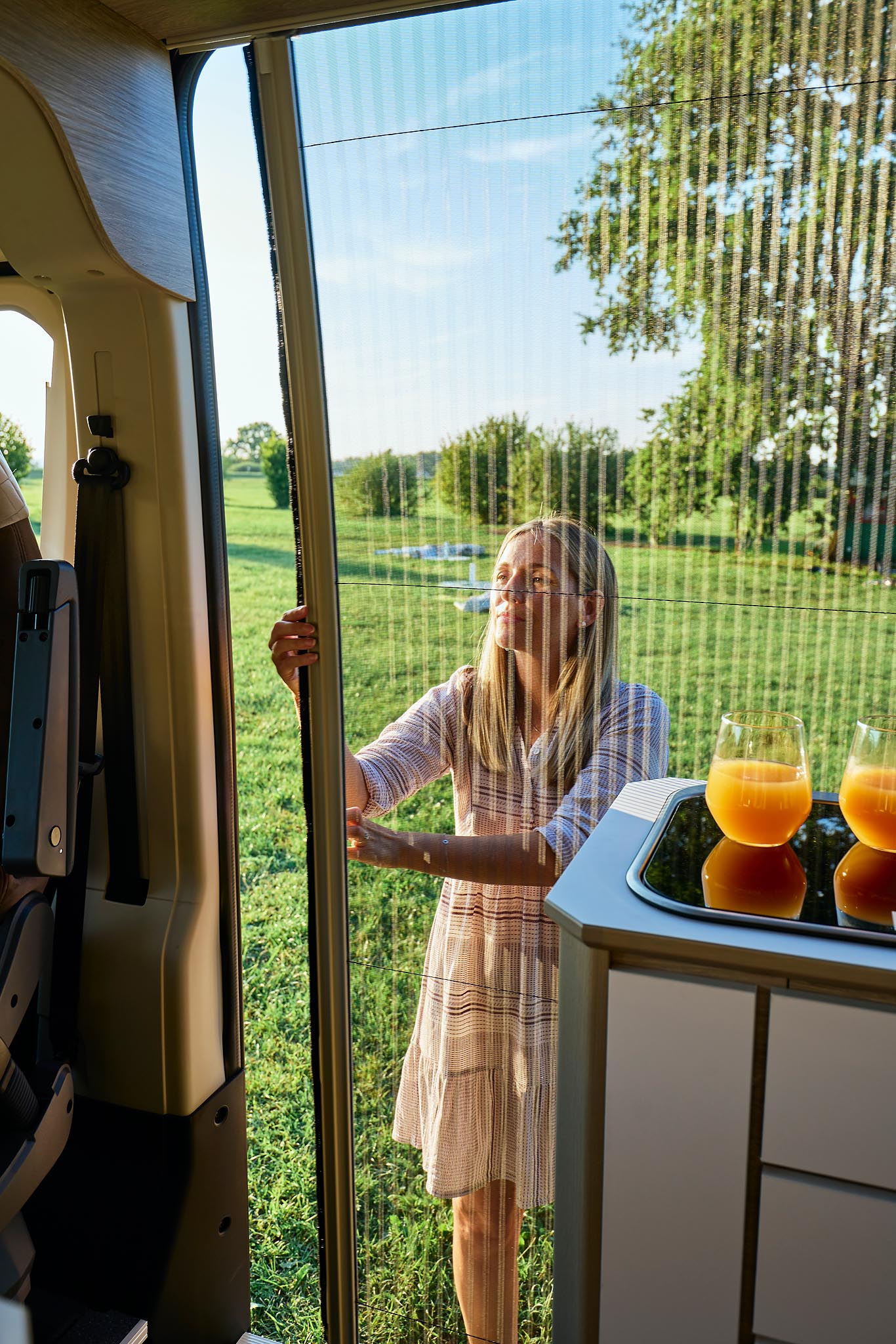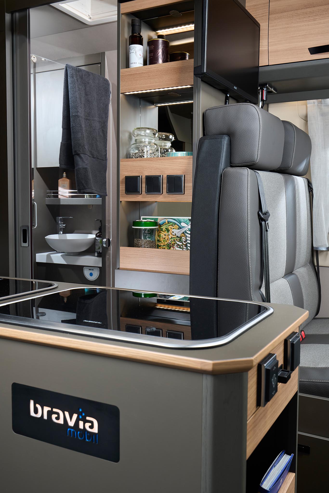 Der Wohnbereich ist modern, hell und funktional gestaltet. Die Küche überzeugt mit einem großen Dometic Kühlschrank inklusive Gefrierfach – ideal für längere Reisen – sowie einem 2-Flammen-Gaskocher, der spontanes Kochen unterwegs kinderleicht macht. Egal ob schneller Espresso am Morgen oder gemütliches Abendessen: hier fühlt man sich sofort zuhause.