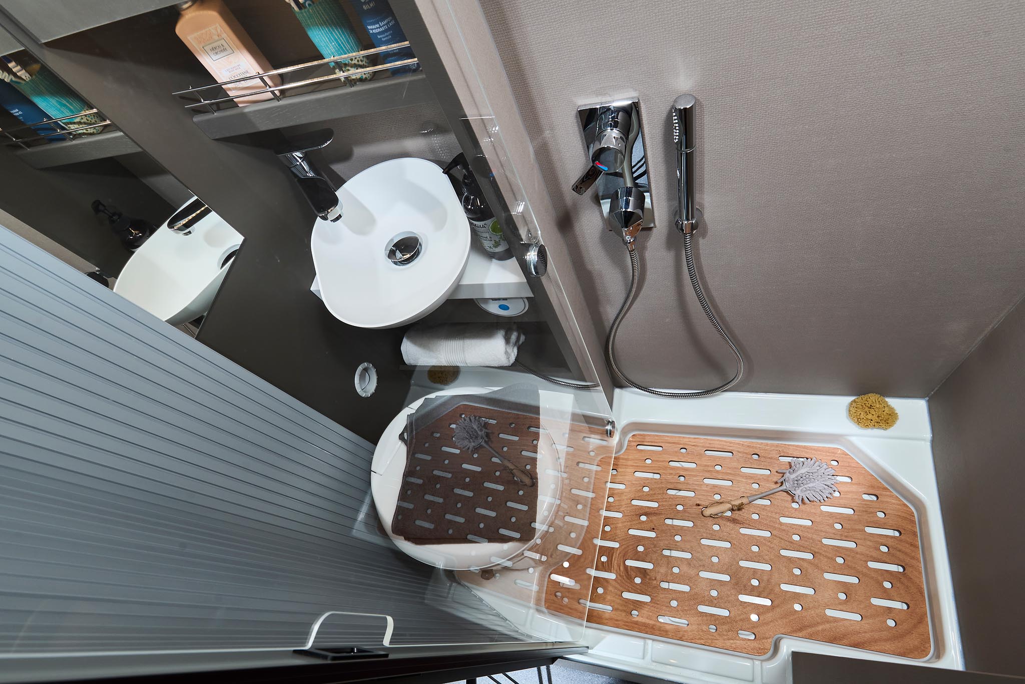 Im Bad zeigt der Swan 636 seine clevere Raumplanung. Eine separate Dusche mit Plexiglas-Trennwand sorgt für Komfort, die schwenkbare Kassettentoilette von Thetford für Alltagstauglichkeit. Alles ist leicht zu reinigen, stabil verarbeitet und optimal auf Vanlife abgestimmt.
