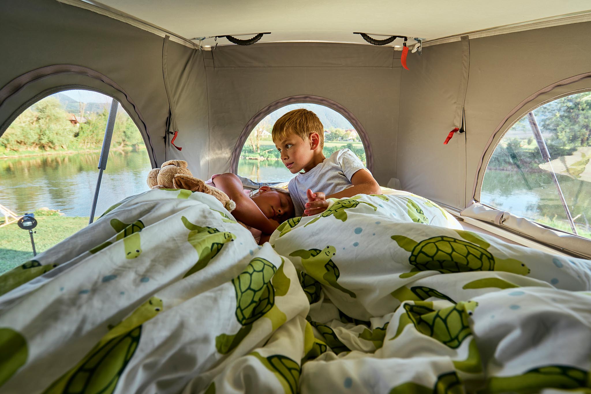 Im Heck befinden sich zwei Längsbetten, die sich im Handumdrehen zu einem großzügigen Doppelbett (ca. 140 × 197 cm) verbinden lassen. Kein nächtliches Umbauen, kein Stress.