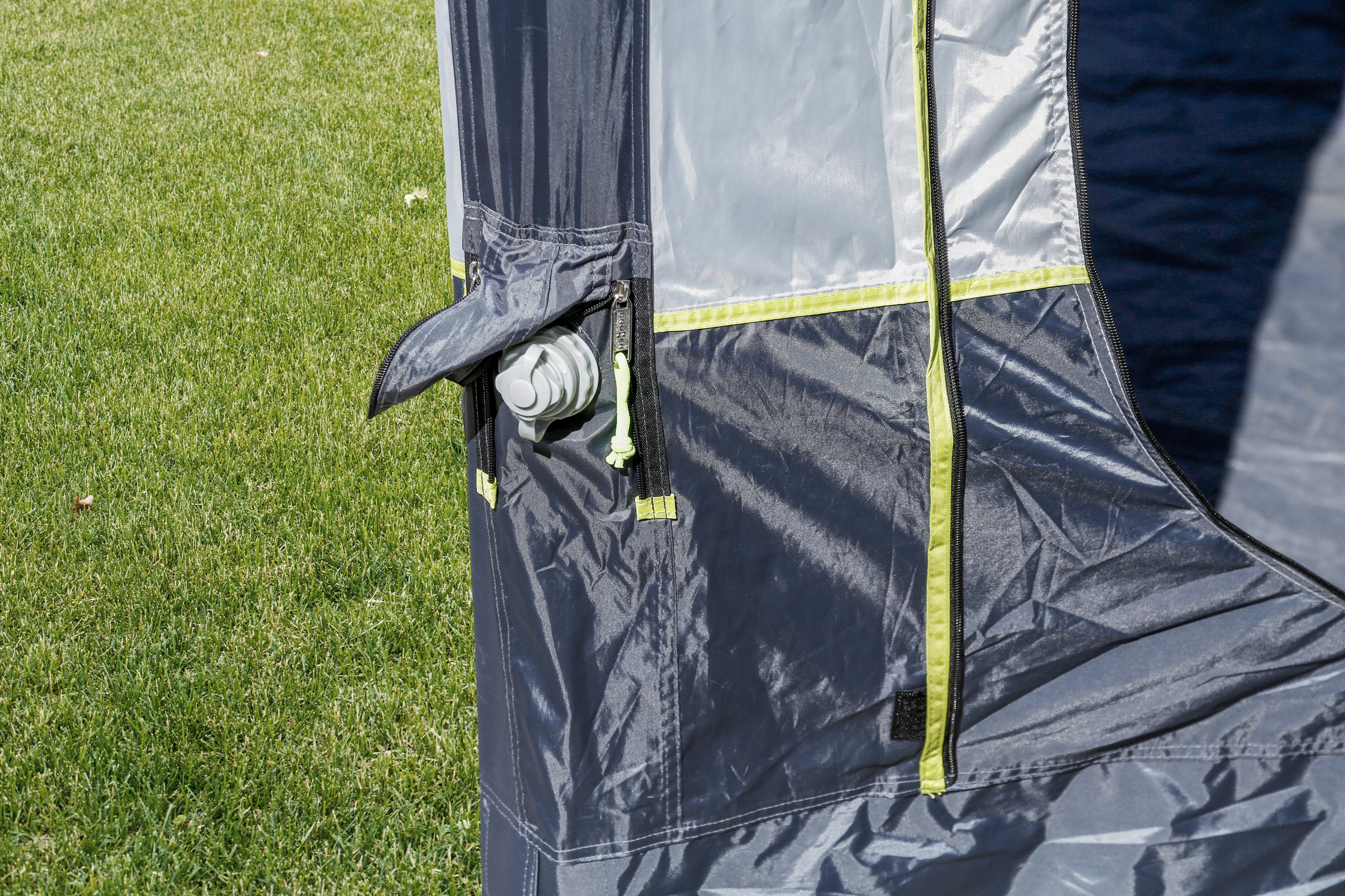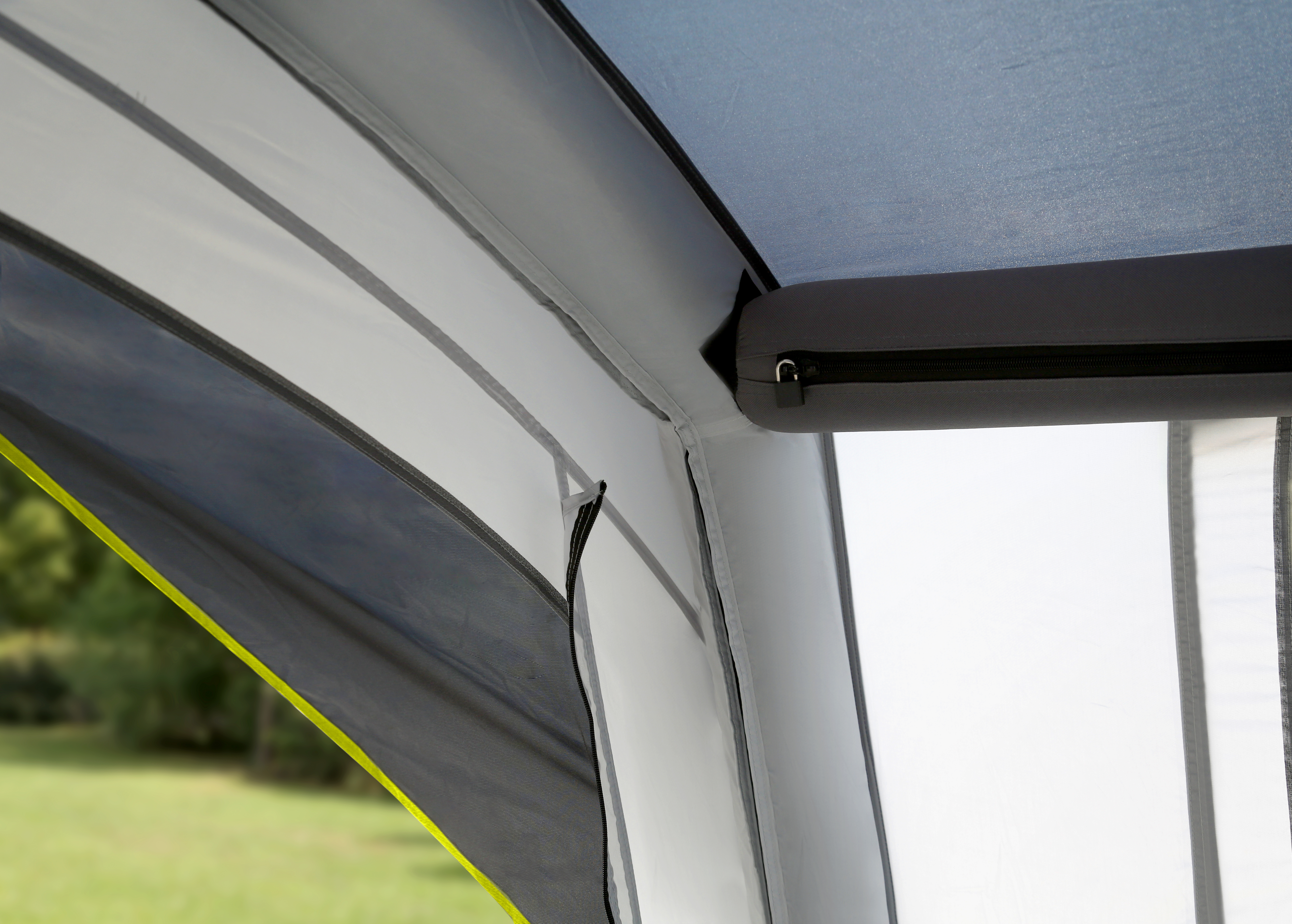 Im Inneren überzeugt das Brunner Tech Trails HC mit durchdachtem Komfort. Alle Fenster sind vollständig verdunkelbar, sodass du jederzeit Privatsphäre hast oder das Zelt kühl halten kannst. Vorder- und Seiteneingang sind mit Moskitogaze ausgestattet – perfekt für warme Sommerabende ohne lästige Insekten. Das Schutzdach an der Vorderseite bietet zusätzlichen Wetterschutz bei Regen oder starker Sonne.