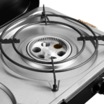 Die zwei Kochstellen sind unabhängig steuerbar, jede mit eigener Zündung und Drehregler. Während links der Kaffee kocht, kannst du rechts schon dein Frühstück braten – multitasking wie ein Profi.