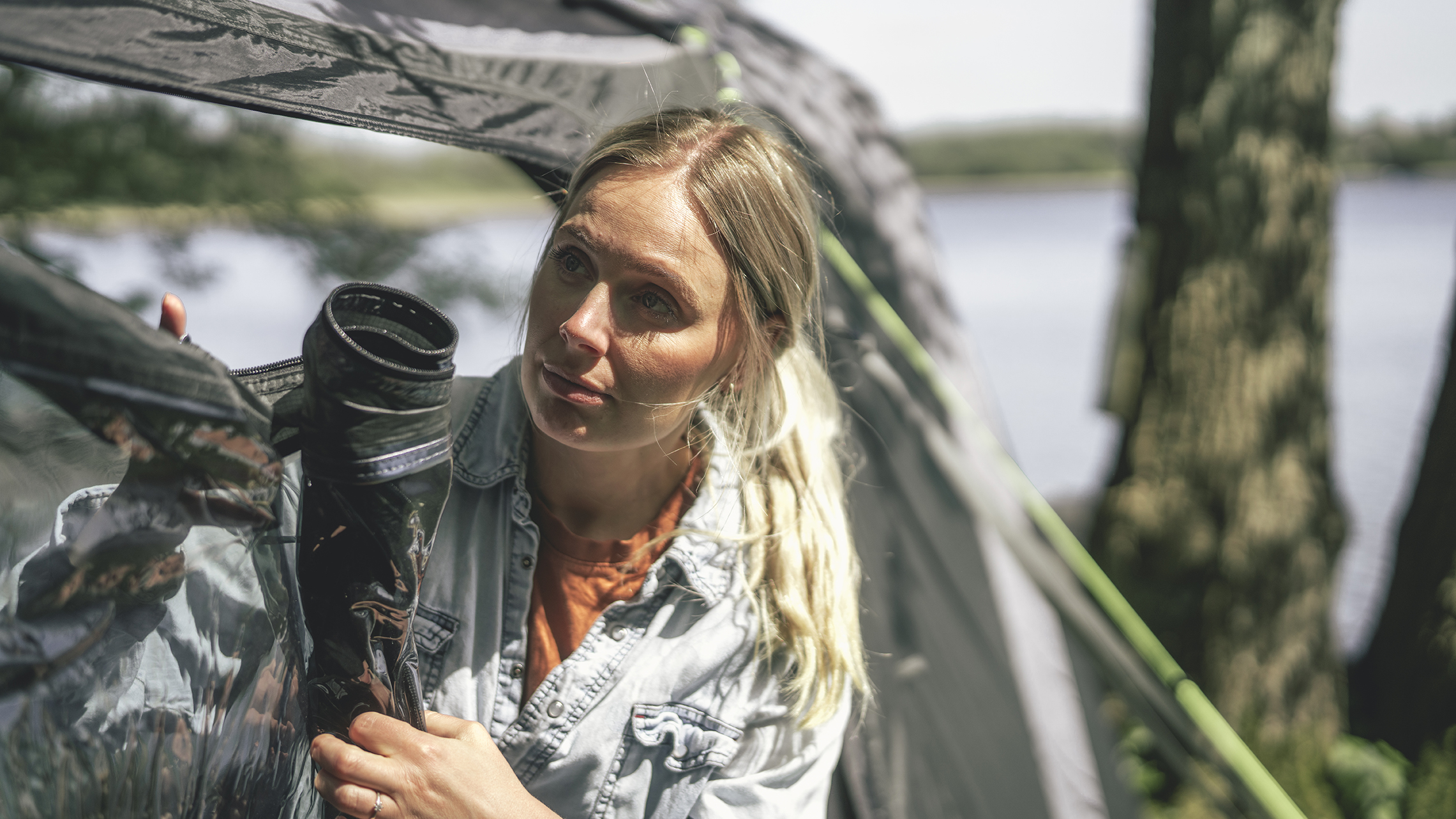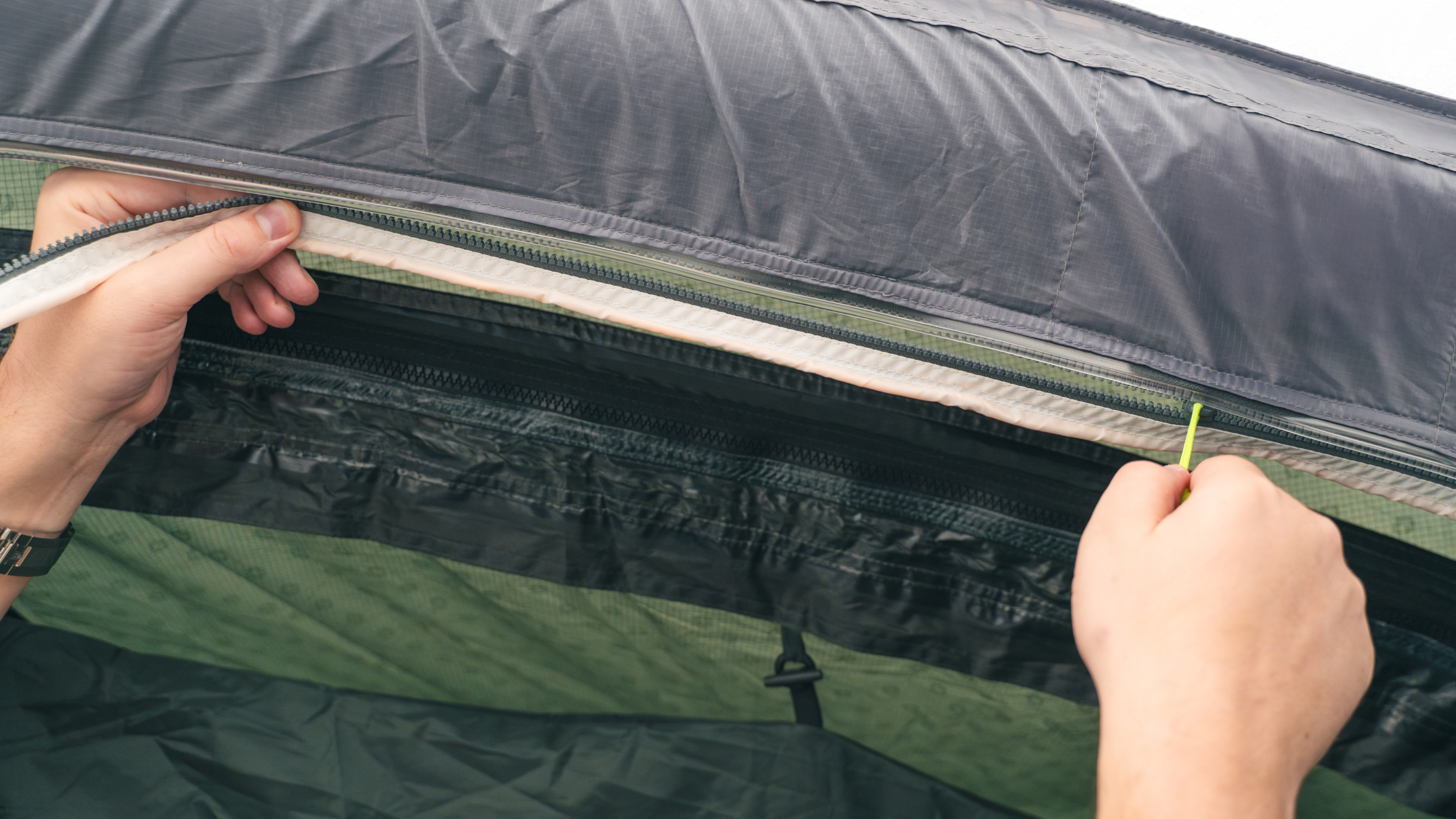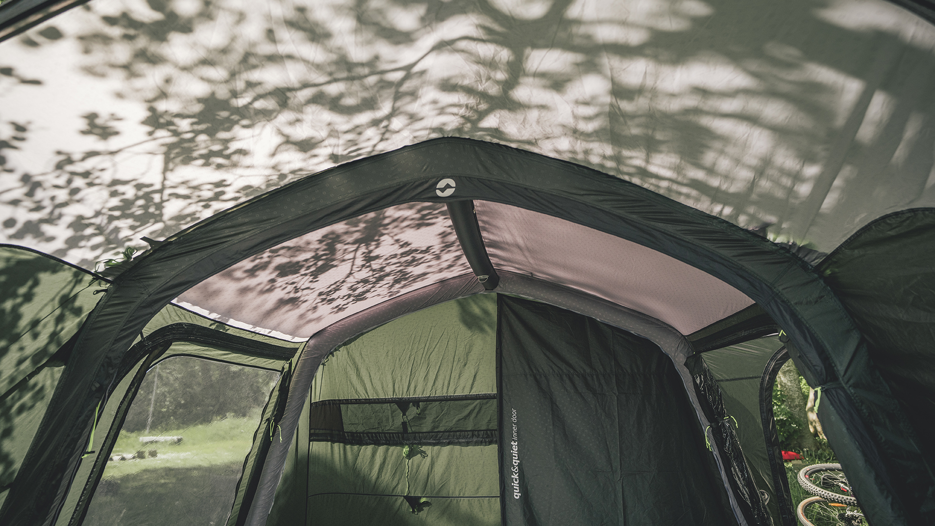 Im Innenraum punktet das Vorzelt mit durchdachtem Komfort: Zwei große Seitentüren mit Moskitonetz, zusätzliche Netzfenster in der Front und viele Belüftungsmöglichkeiten sorgen für frische Luft ohne Insekten. Die einhängbare Trennwand mit Quick & Quiet Magnetverschluss erlaubt es dir, einen Schlaf- oder Stauraumbereich abzutrennen – super praktisch auf längeren Trips.