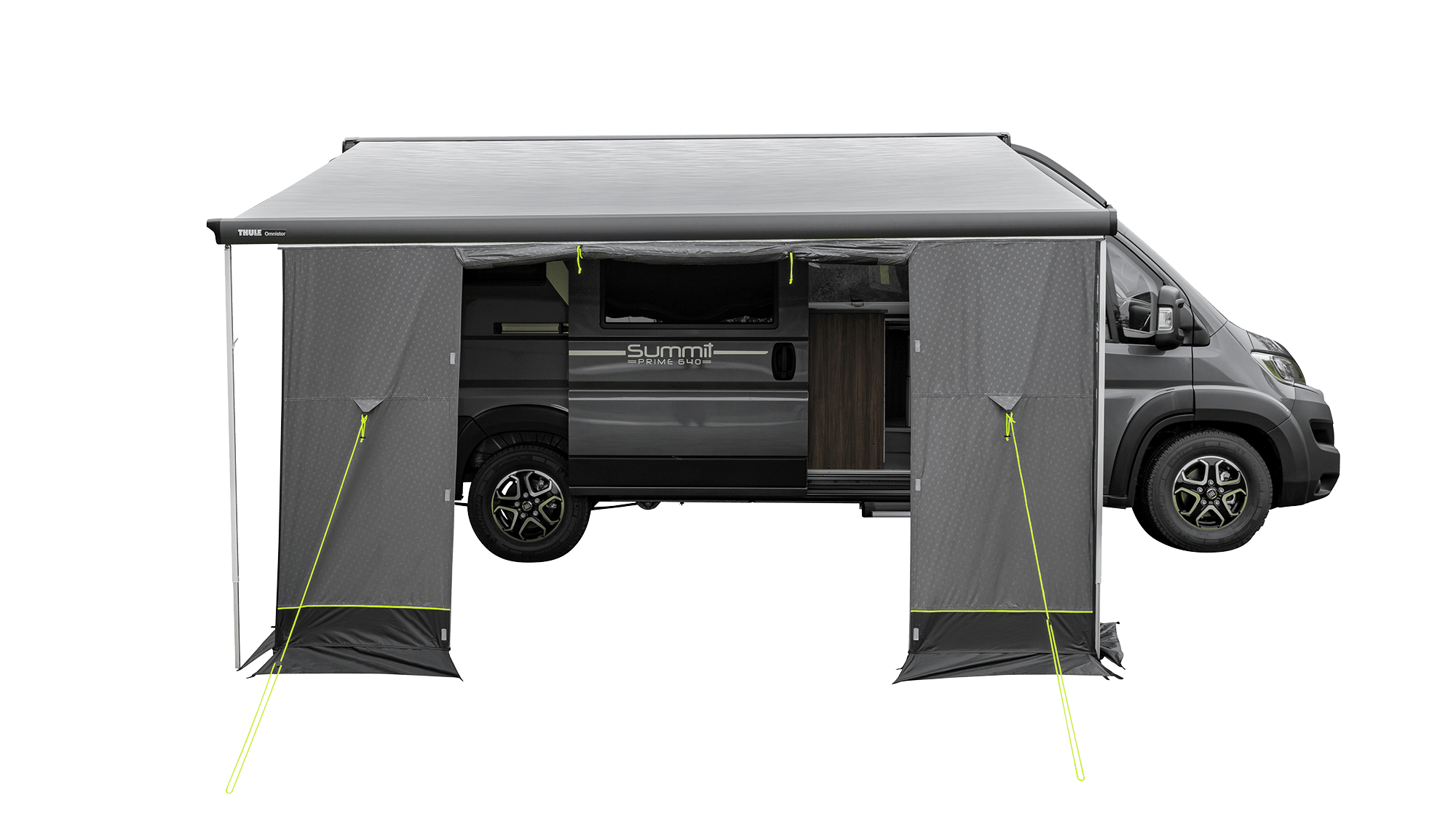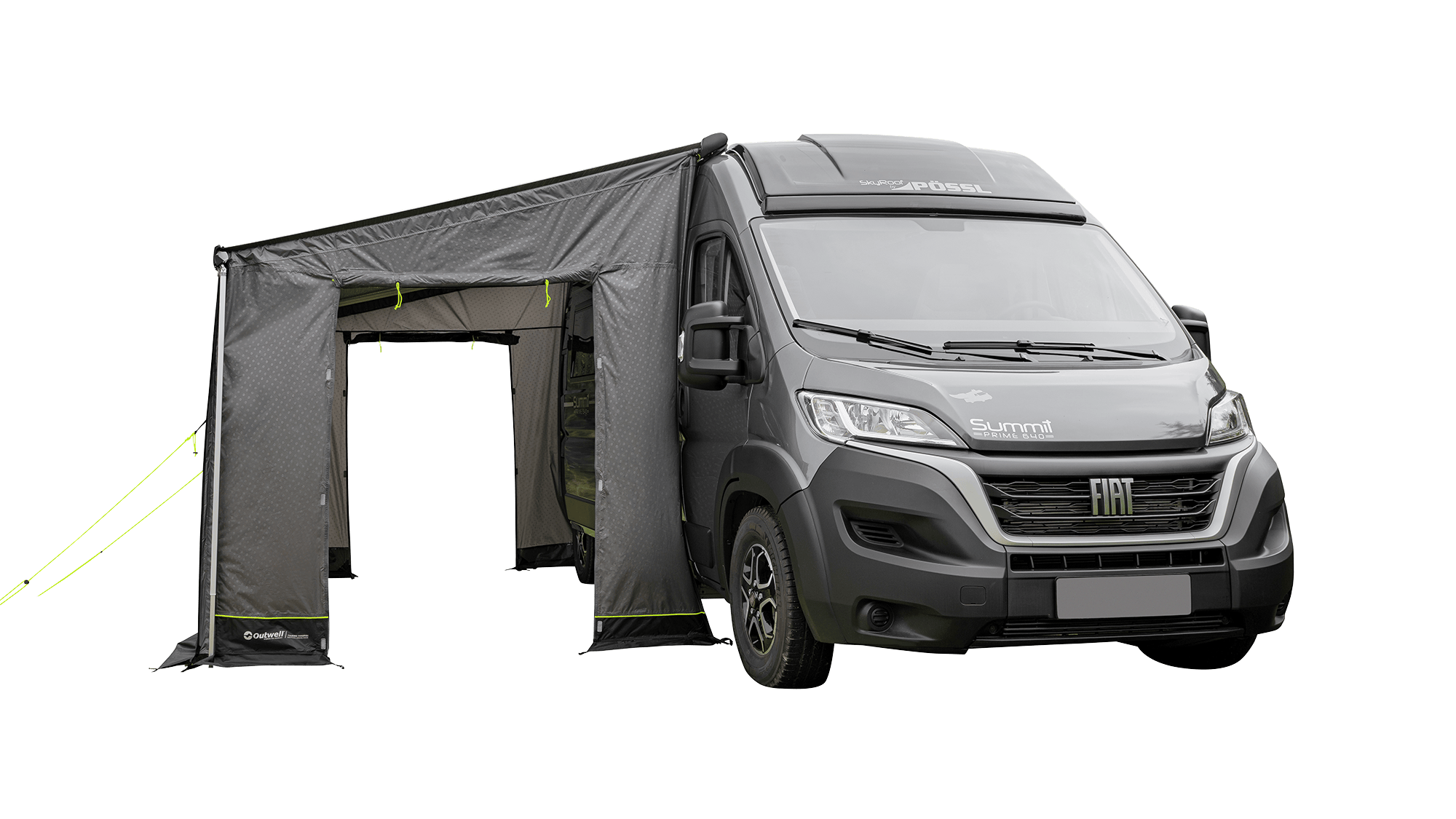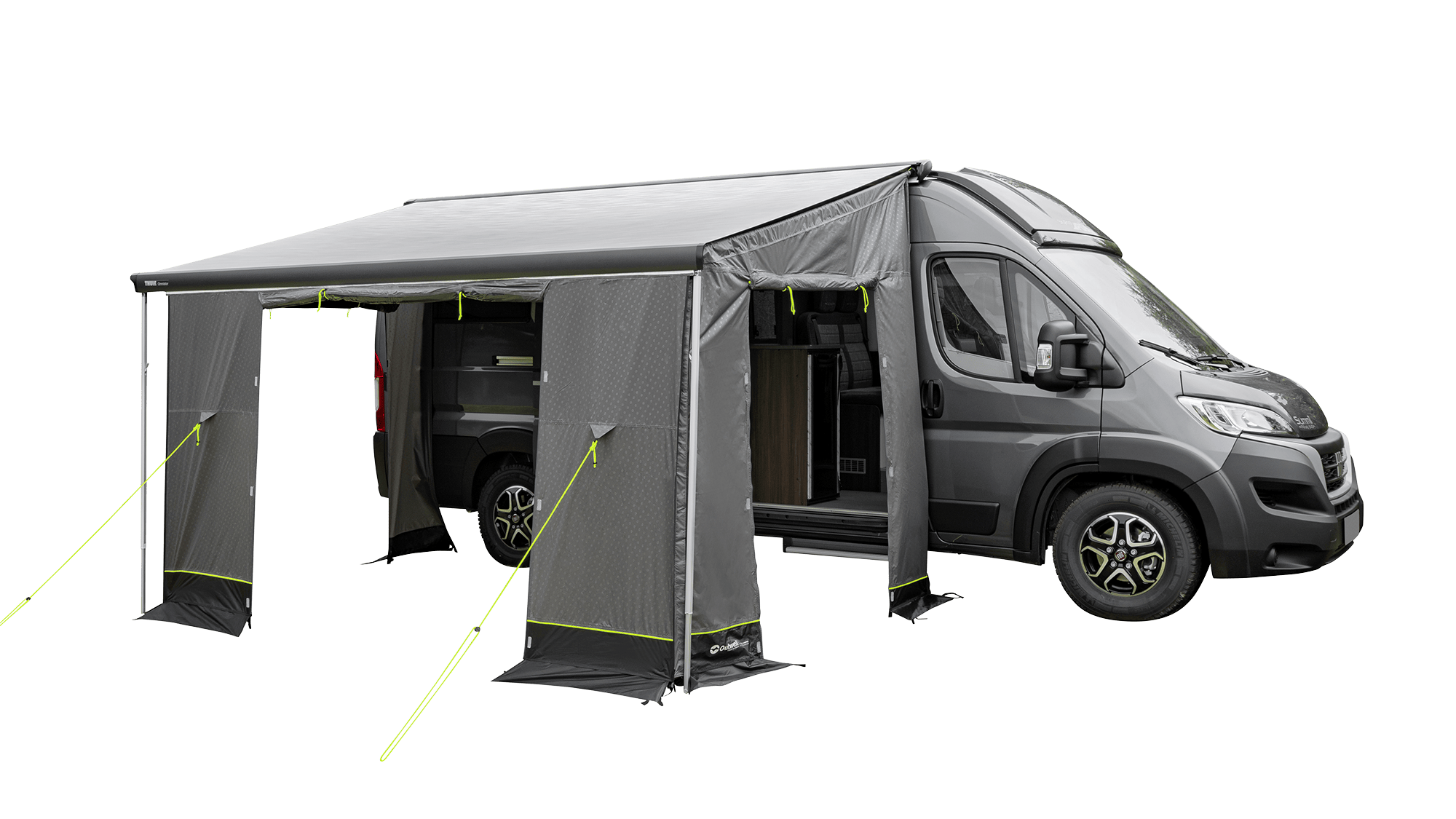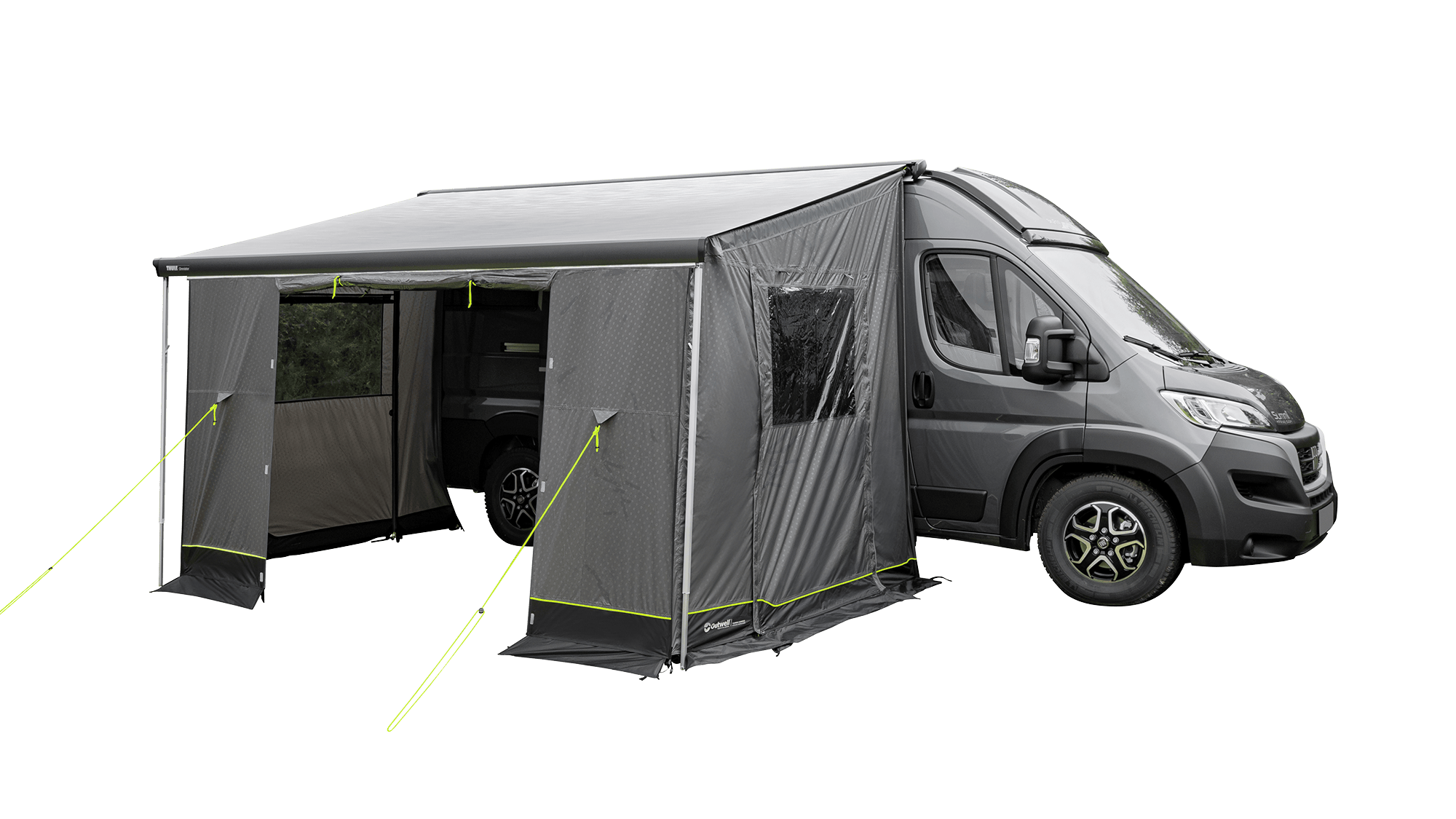 Hergestellt aus robustem Outtex® 4000 Select Polyester mit einer Wassersäule von 4000 mm bietet das Sideroads Awning Room zuverlässigen Schutz vor Regen, Wind und Sonne (UV-Schutzfaktor 30+). Dank seiner Abmessungen eignet es sich besonders für höhere Fahrzeuge wie Fiat Ducato, Mercedes Sprinter oder teilintegrierte Reisemobile mit Markisenbreiten von 375–450 cm und einem Auszug von 250 cm.