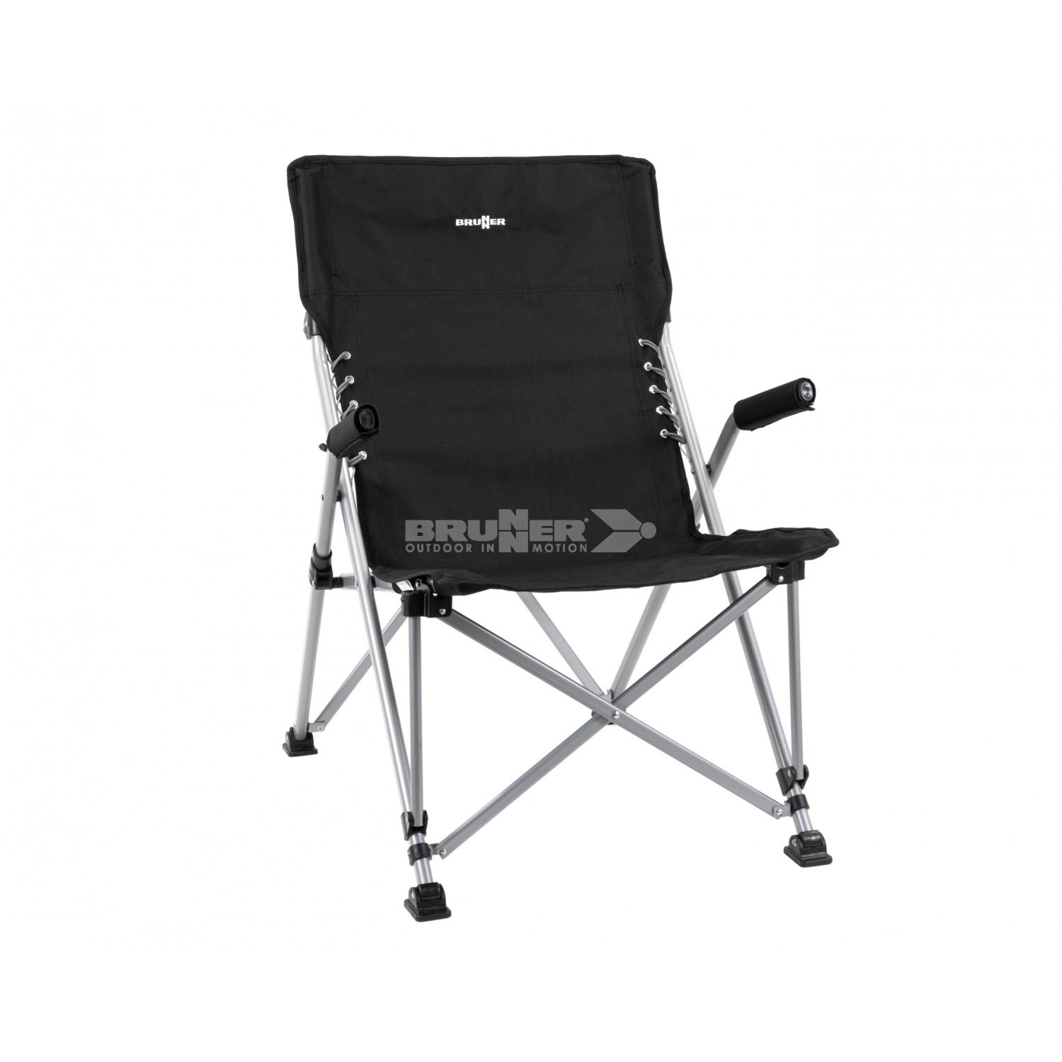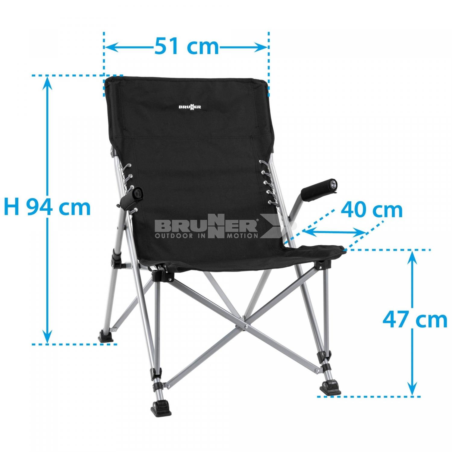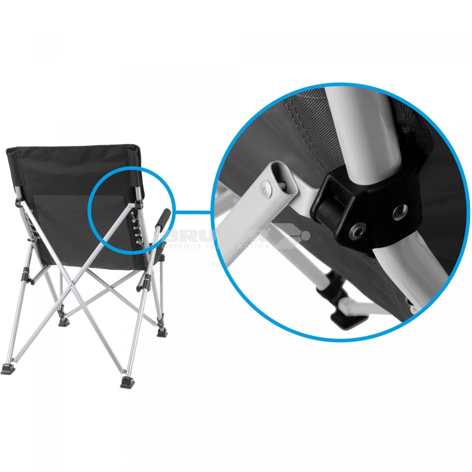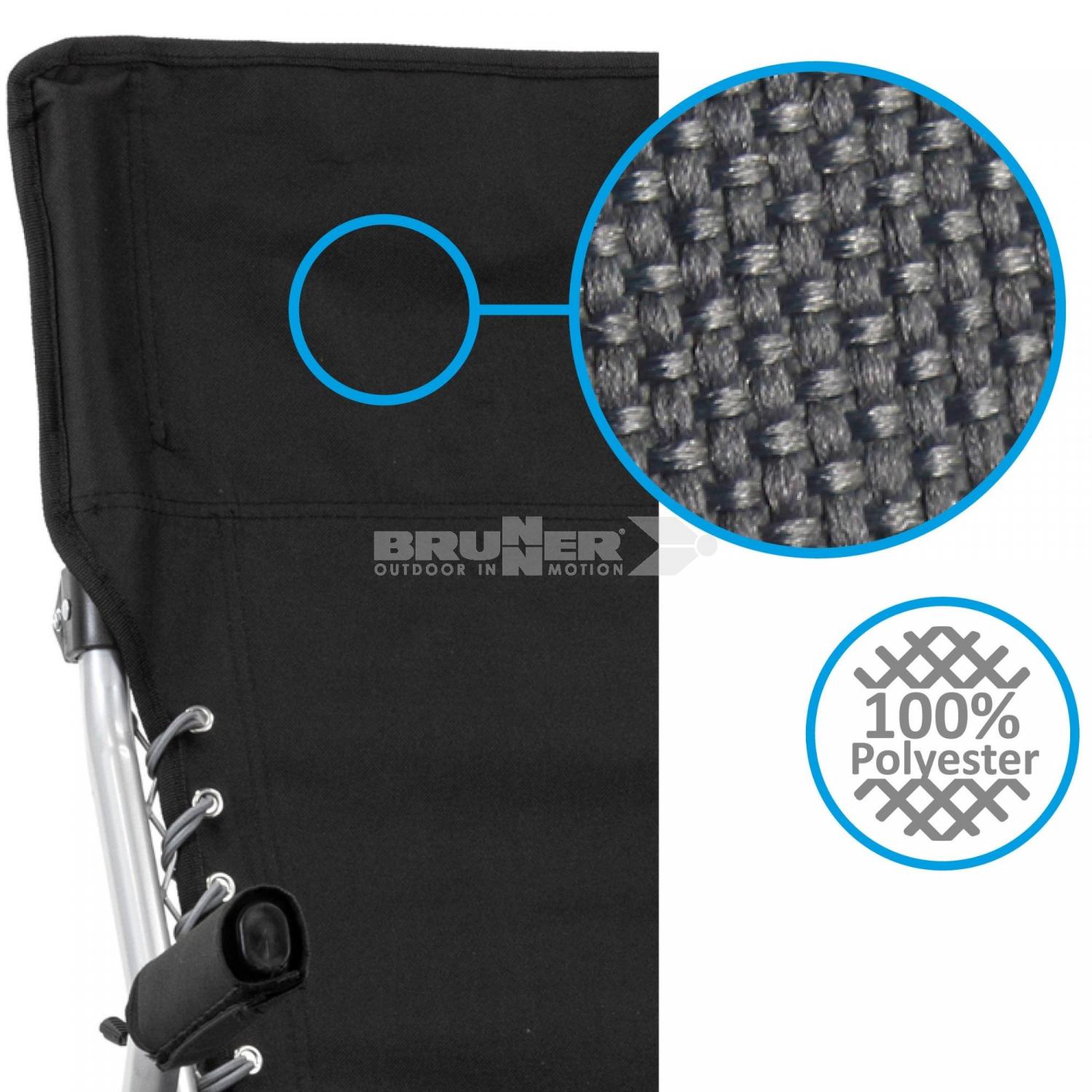 Komfortabler Faltstuhl mit elastisch geschnürter Rückenlehne. Mit Packsack.