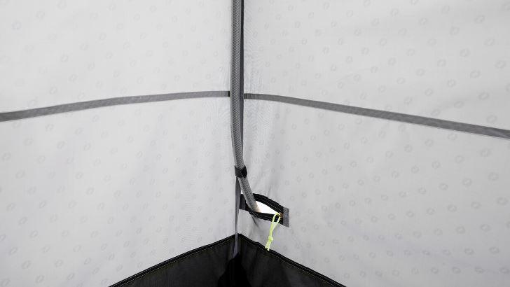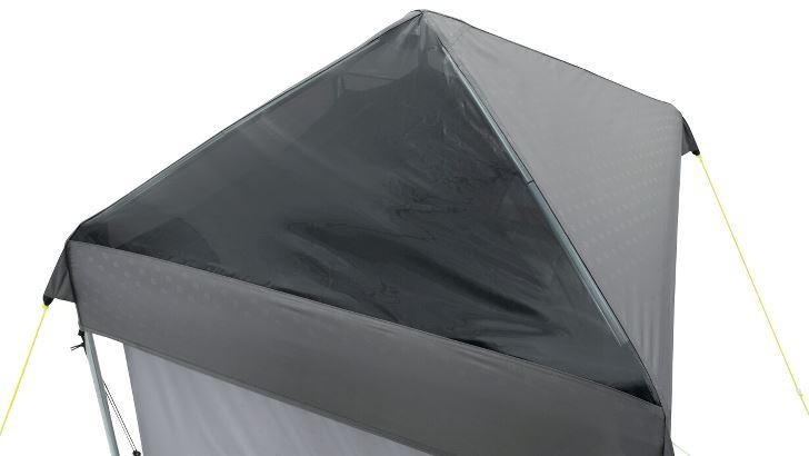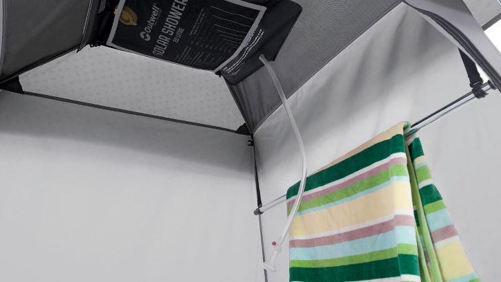 Die integrierte Bodenwanne mit Ablaufgitter ermöglicht einen hygienischen Duschvorgang. Das Vinyl-Dachfenster fördert durch Sonneneinstrahlung das Erwärmen von Wasser in einem optionalen Solarduschsack. Belüftung, Stauraum, Handtuchhalter und eine Reißverschlussöffnung für einen Wasserschlauch komplettieren das Setup.